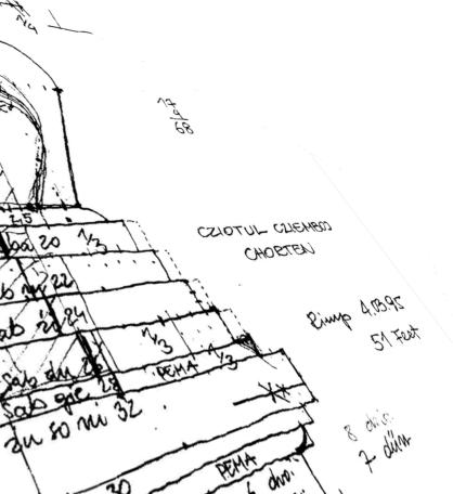 Krok po kroku, linia po linii, szczegółowy rysunek techniczny Stupy tybetańskiej